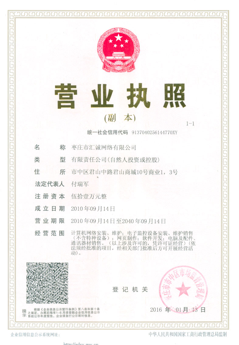 特提供三證合一后的新營業(yè)執(zhí)照副本如下   棗莊市匯誠網(wǎng)絡(luò)有限公司營業(yè)執(zhí)照(統(tǒng)一社會信用代碼:9137040256144770XY)